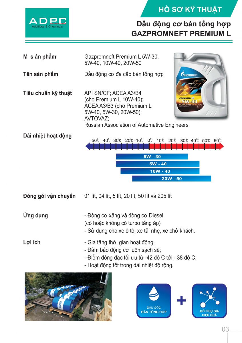 Dầu động cơ bán tổng hợp L Gazpromneft Premium L chế tạo theo các tiêu chí 5W-30, 5W-40, 10W-40, 20W-50.